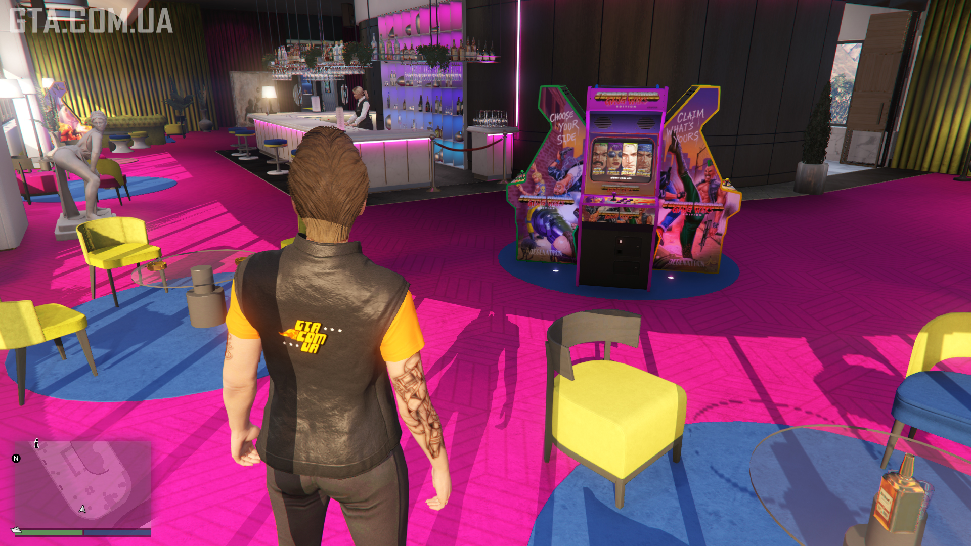 Price: GTA$ 700,000The largest room in the penthouse, where drinks are served (beer, vodka, and whiskey are free; champagne costs money; you can pour whiskey yourself at one of the tables), and arcade machines allow you to play Invade and Persuade II and Street Crimes: Gang Wars Edition. Guests (NPCs) come here after organizing a Members Party. They will socialize and drink. You can also invite other players. During this time, there will be two bartenders at the bar, and the radio cannot be used. The party will not end even if you leave the Penthouse or switch characters — to get rid of the guests, you need to exit the game. Afterward, the room will be left messy with puddles and trash. All of this can be cleaned up by ordering the Cleaning Service.