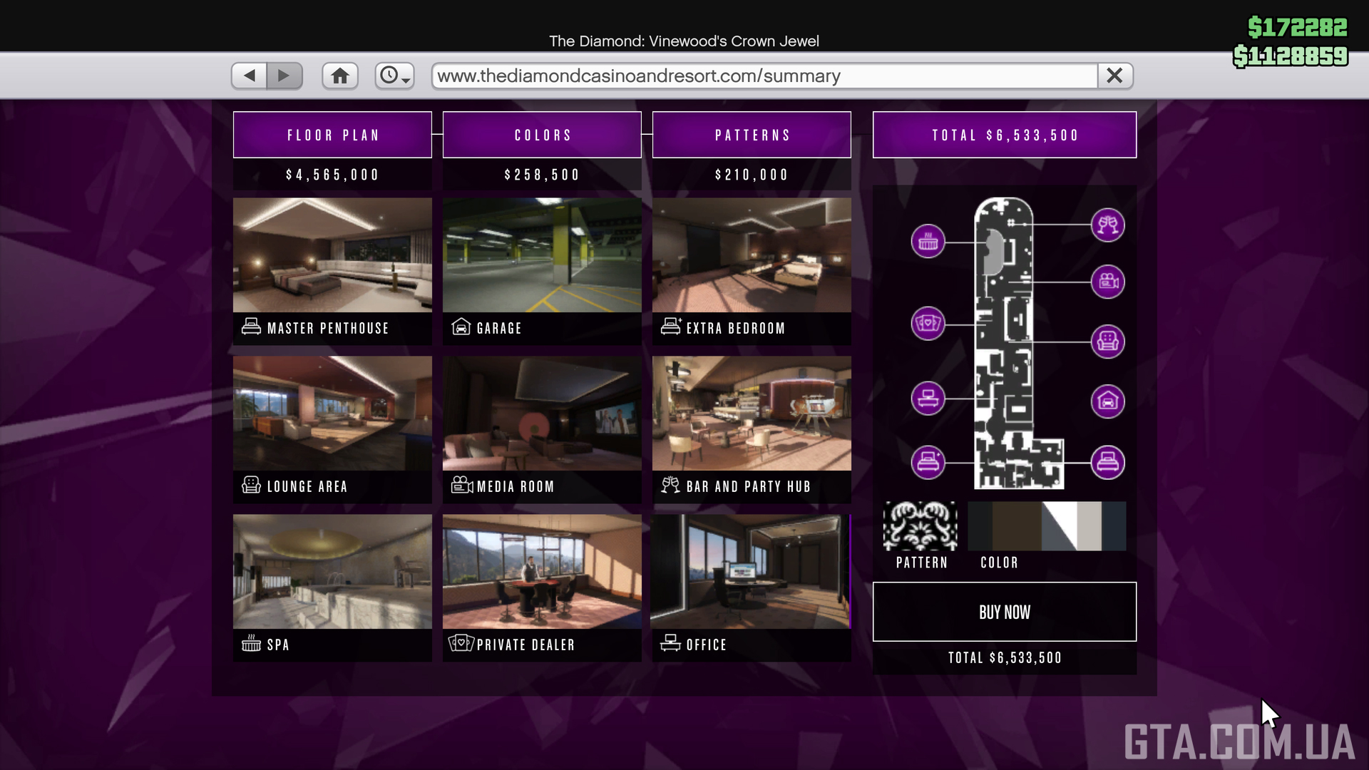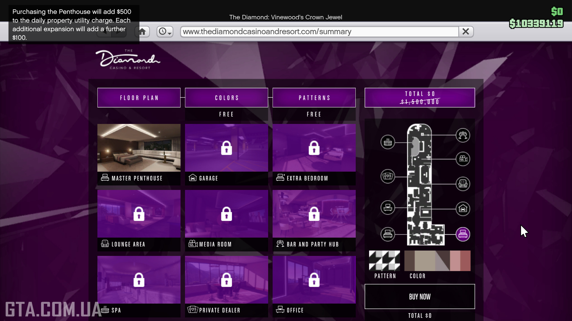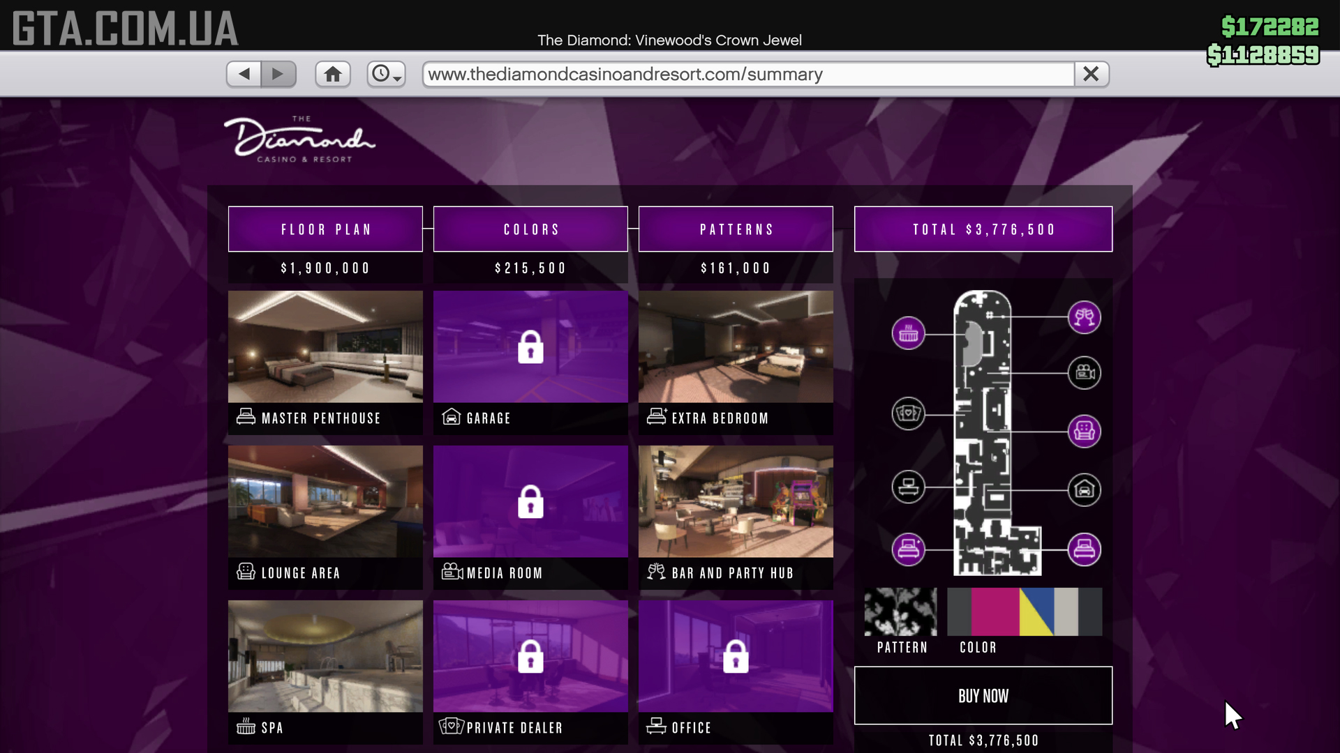 You can purchase a penthouse on the website thediamondcasinoandresort.com via the in-game Internet (located in the Money and Services category and among the icons on the main page) in the Penthouses section by choosing one of several options. They differ in renovations and the number of available rooms, but any of them can be customized to your taste.Design Your Own