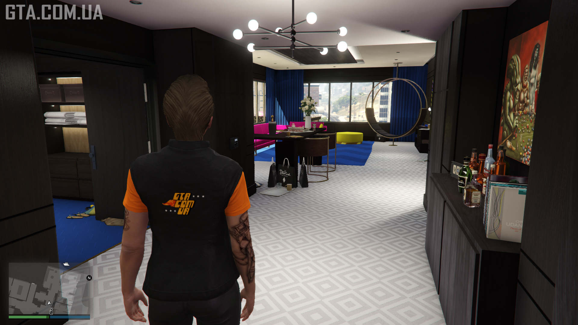 The largest room in the penthouse, where drinks are served (beer, vodka, and whiskey are free; champagne costs money; you can pour whiskey yourself at one of the tables), and arcade machines allow you to play Invade and Persuade II and Street Crimes: Gang Wars Edition. Guests (NPCs) come here after organizing a Members Party. They will socialize and drink. You can also invite other players. During this time, there will be two bartenders at the bar, and the radio cannot be used. The party will not end even if you leave the Penthouse or switch characters — to get rid of the guests, you need to exit the game. Afterward, the room will be left messy with puddles and trash. All of this can be cleaned up by ordering the Cleaning Service.