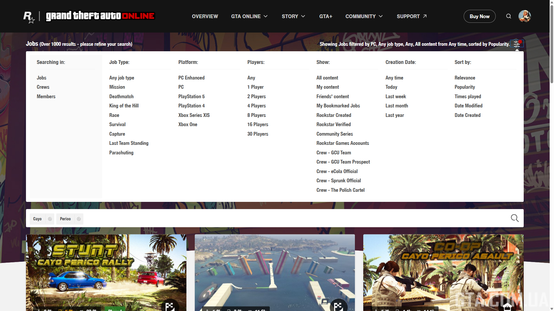 - Set the following filters: Any Job type, Any number of Players, All content, and Any time.