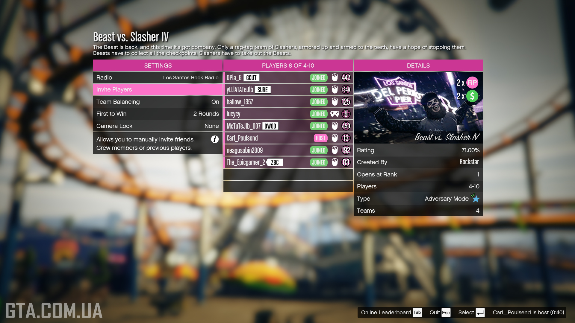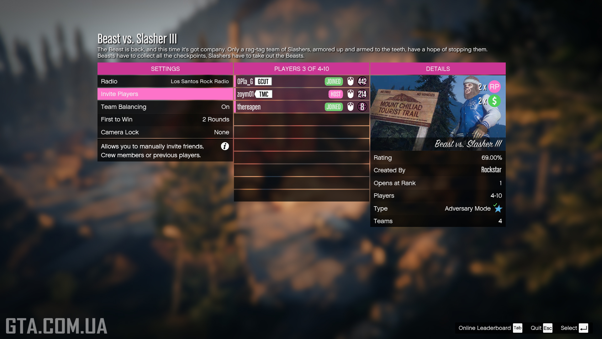When the mode is active, it can be joined via an invitation, the main menu (if featured), the Featured Series marker at Legion Square, or through the Pause Menu (Online → Quick Join → Play Job → Rockstar Created → Adversary Modes). Players can set rounds from 1 to 2 wins. When a slasher kills a beast, they take its place in the next round. All players can participate regardless of rank, with 4–10 players divided into four teams: Beasts and three kinds of Slashers.Team: Beasts
