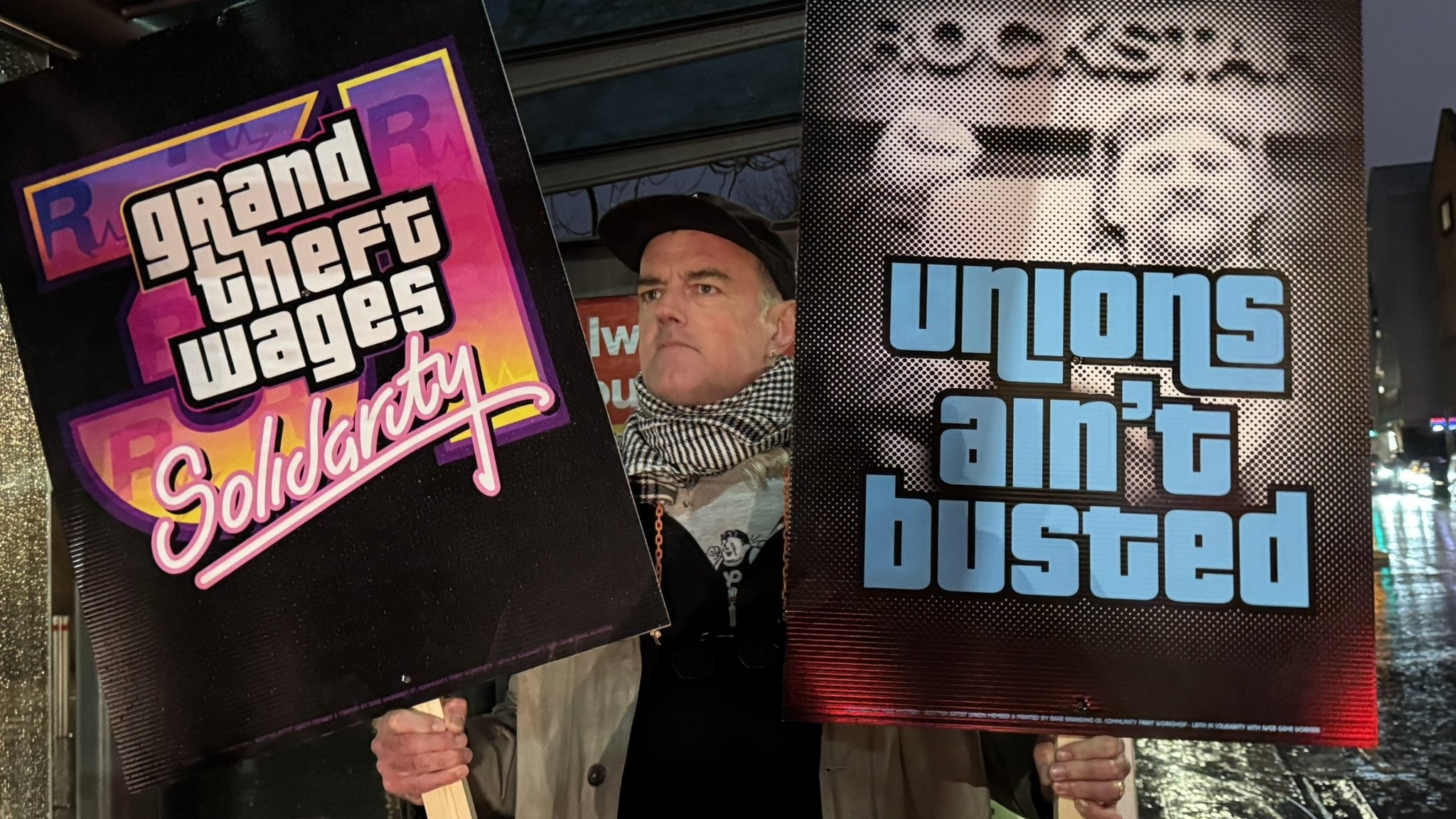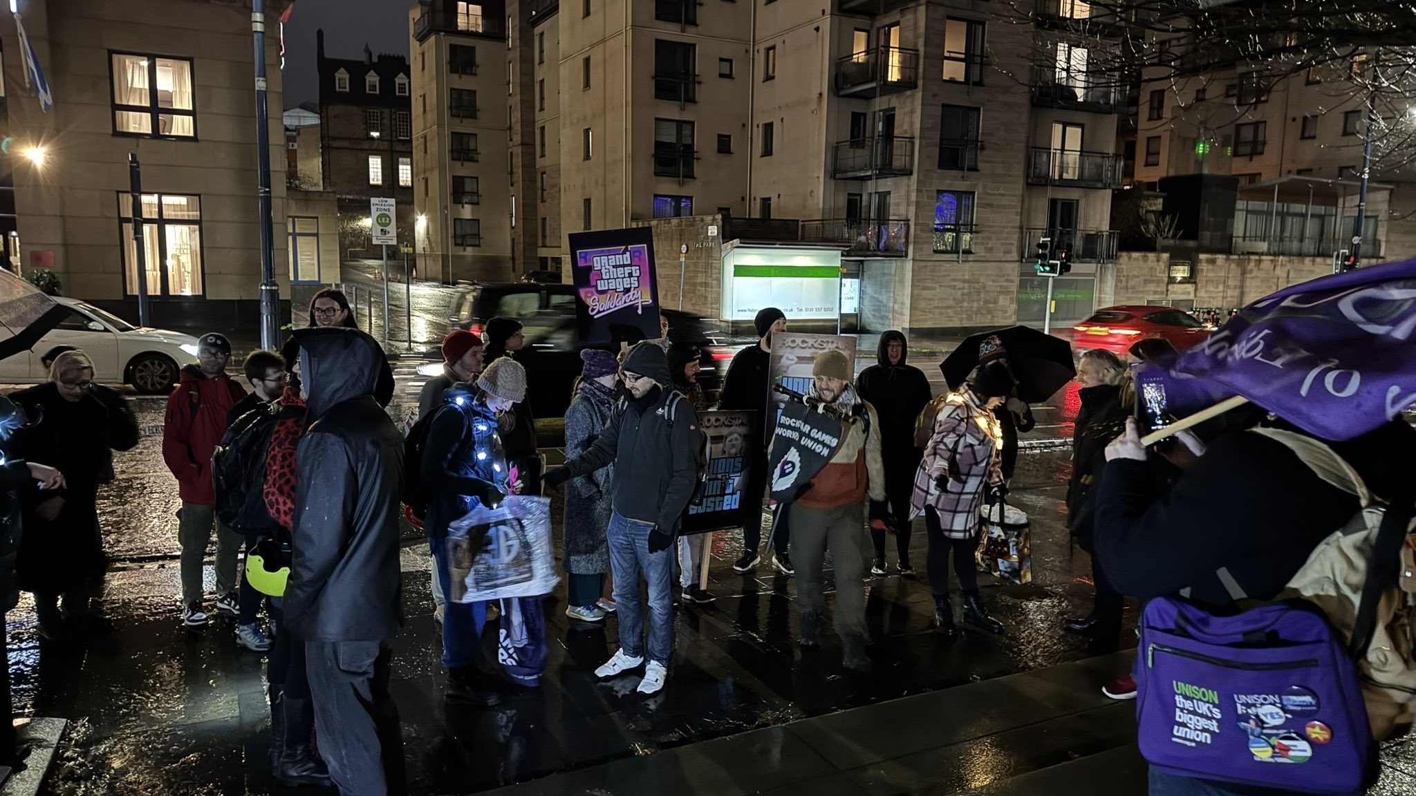 8The story of the conflict between Rockstar Games and the union continues (part one, part two, and part three). As promised, on November 17 a new protest was held outside the Rockstar North headquarters. Gathering on a rainy Monday evening to the music from Trailer 1, the demonstrators chanted slogans and demands, and then marched toward nearby Parliament.