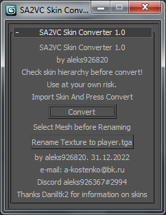 Скрипт для автоматического конверта скинов с СА на ВС. Использовать на свой страх и риск. Перед использованием убедиться, что иерархия скина совпадает со стандартной (нормальной) иерархией. Образец иерархии есть в архиве со скриптом.