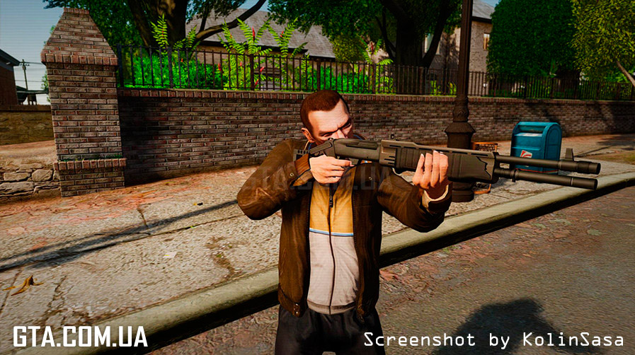 Это славный, проверенный временем дробовик из солнечной Италии. Отличается сложностью конструкции и разными фишками (вроде переключения на помповый режим). Не прижился в массовом вооружении из-за своего веса. Модель для GTA 4 поддерживает все функции движка, руки стрелка лежат на стволе правильно. Плюс есть запасные патроны на боковой стороне.
