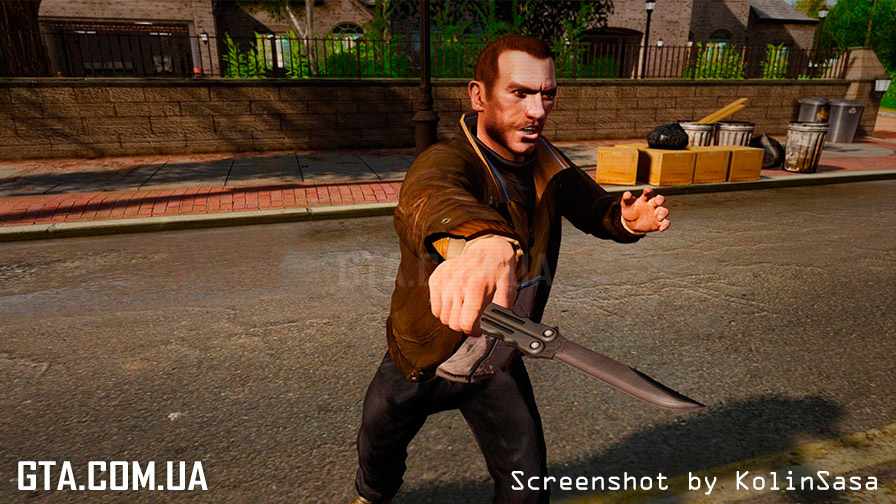 С помощью программы SparkIV или OpenIV, замените в файле "weapons.img" (он находится в "Rockstar Games\Grand Theft Auto IV\pc\models\cdimages"), файлы "w_knife.wft" и "w_knife.wtd" на аналогичные из архива.