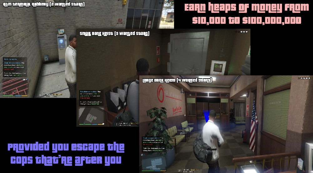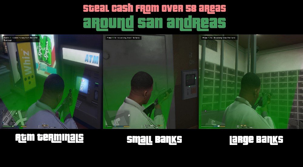 Мод позволяет игроку красть деньги из банкоматов или совершать ограбление банков, доступных по всему Сан-Андреасу.