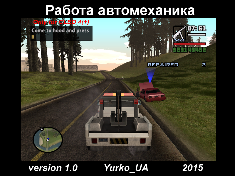 3. Когда приедете, выйдите с автомобиля, подойдите к капоту сломанной машины и нажмите клавишу R (кирилическая К), и Карл начнет "ремонтировать" автомобиль.