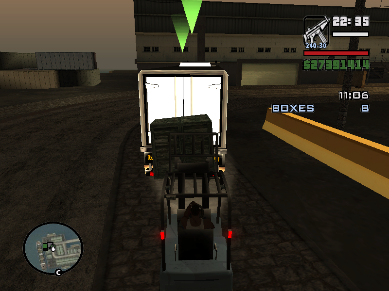 3. Едете к дверям трейлера, подьезжаете поближе и нажимаете G. Ящик "погрузился". Теперь езжайте за следующим ящиком, если это был последний - машина уедет, вам дадут деньги. На экране появится надпись: сколько машин загружено и сколько ящиков погружено.