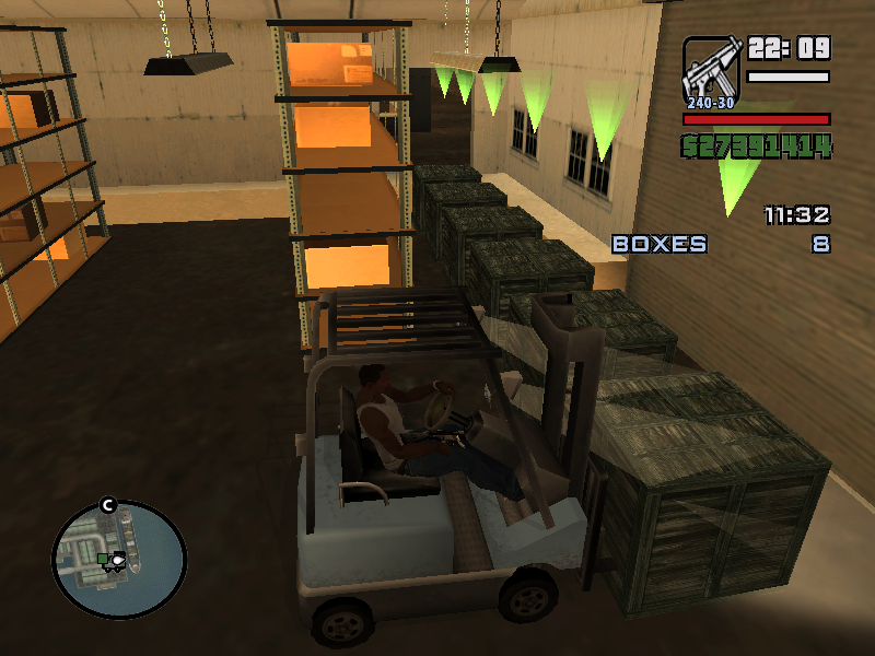 Если вам вдруг стало скучно, езжайте в морской порт Лос-Сантоса и устройтесь на новую работу. Все, что вы будете делать - это на машине Forklift перегружать ящики со склада в трейлер. За раз может быть от пяти до восьми ящиков. За это вам будут платить деньги - сума зависит от количества ящиков и того, как быстро вы их погрузите. Время, которое вам будет дано, также зависит от количества ящиков. Настройки таймера я, как всегда, вынес в текстовый файл. Игровые тексты, как всегда, переведены на 3 языка: украинский, русский, английский.