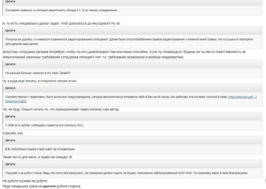 Kesha F1 Опубликовано 2 июля, 2018 Жалоба Поделиться Опубликовано 2 июля, 2018 liaz6212, Бан на 7 дней за оскорбление администрации. Знаю, что это сообщение будешь читать в гостевом доступе. Ничем необоснованные грязные слова и ругательства - самое низкое и подлое, что может сделать человек. И пока кипит ярость, попробуй усмирить её и вспомнить то, что было хорошего на GCU и как наше сообщество к тебе относилось: к идеям, предложениям и работам. Ты хотел быть полезным и принёс много пользы всему GTA сообществу. Это твоё достижение и я его признаю и ценю. Но в какой-то момент времени произошли изменения и ты решил «поиграть» с правилами. «Забросы» не оставались без должного внимания. У всех в жизни бывают моменты, когда эмоции переполняют чашу терпения. В том случае было недопустимое выражение (с моей точки зрения) и основной пункт нарушения не оговаривает, что наказания за оскорбления относятся только к пользователям. Составляя правила, я учитывал вероятность обхода 4.1. Д по такому определению. Попытка не удалась: и сначала я ограничился редактированием сообщения. Далее было злоупотреблением правом редактирования и отменой моей правки, что в сущности повторяло допущенное нарушение. Но дальше больше: написал в эту тему. Зачем?! Соответственно с правилами, было выписано предупреждение, которое автоматически отправило тебя в бан на 48 часов. Как работает эта система, почитай в теме: https://gta.com.ua/forum/index.php?showtopic=4820 У тебя есть выбор: соблюдать правила или покинуть GCU. P.S. Некоторым людям я даю шанс на исправление. Подумай и не руби с плеча. Ведь так легко всё разрушить. За примером далеко ходить не будем: пожизненно заблокированный MAD MAX. По-прежнему верю в твоё благоразумие. Цитата Список дисциплинарных мер к пользователям GTA.COM.UA«Ламеров надо обучать. Игроков уважать. Читеров мочить в сортире». © Kesha_F1«Дураку закон не писан. Если писан, то не читан. Если читан, то не понят. Если понят, то не так». © Народное Ссылка на комментарий Поделиться на другие сайты Поделиться