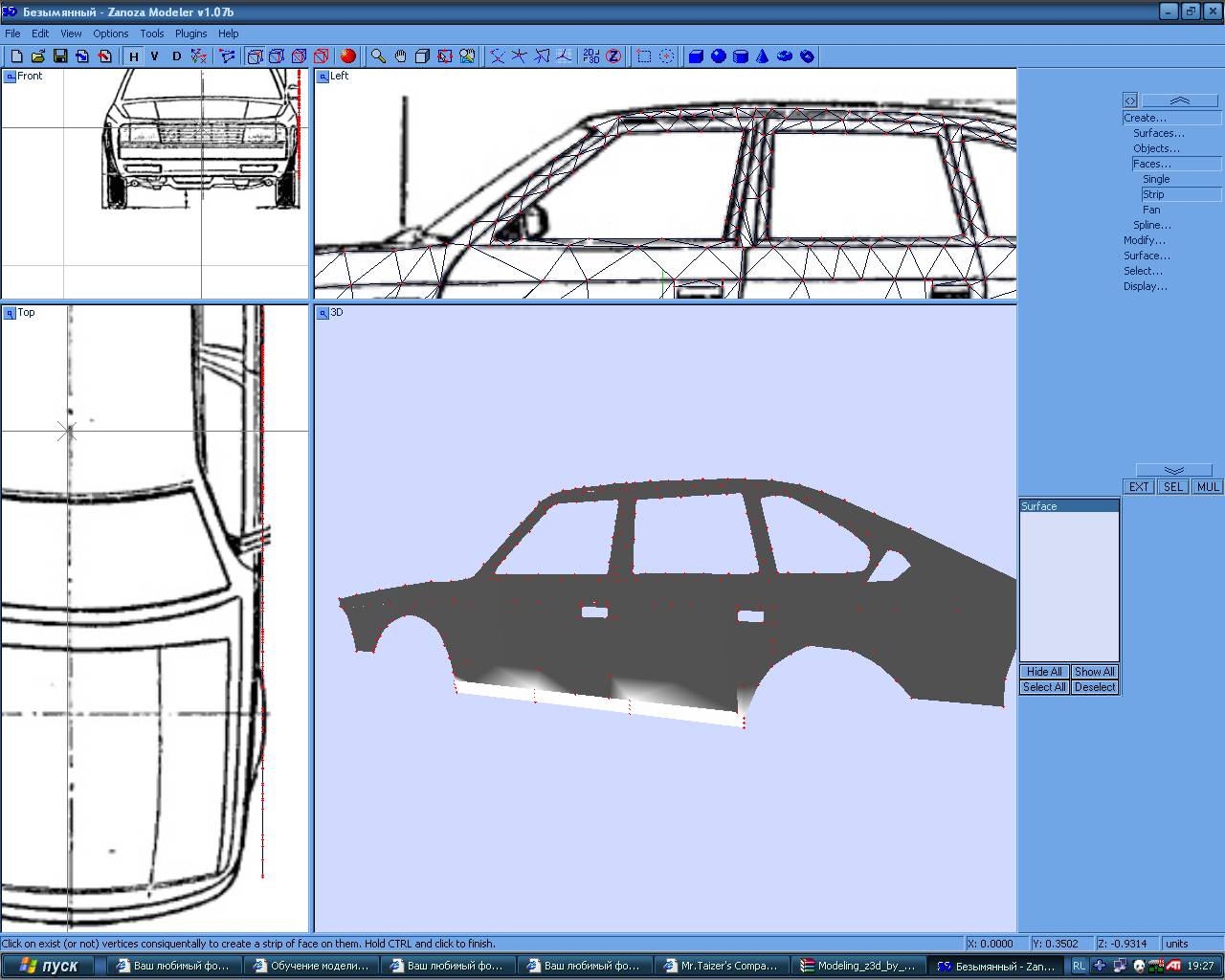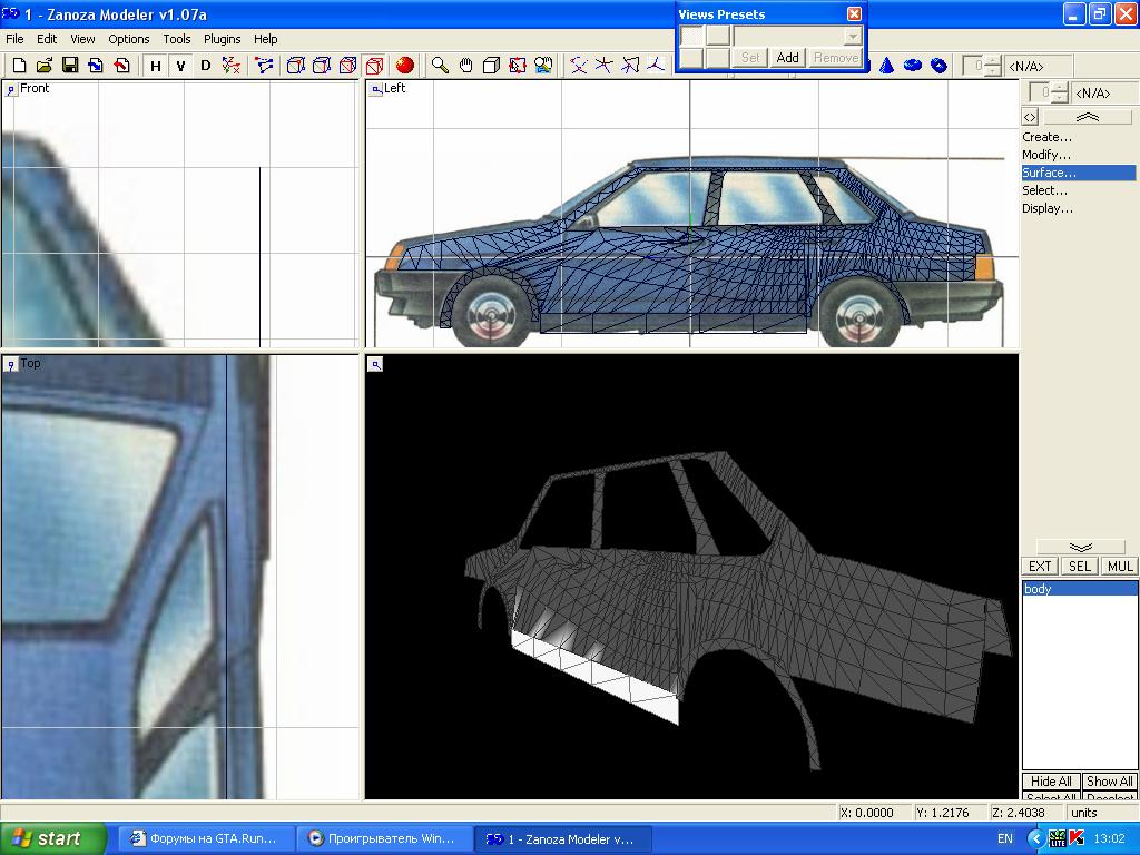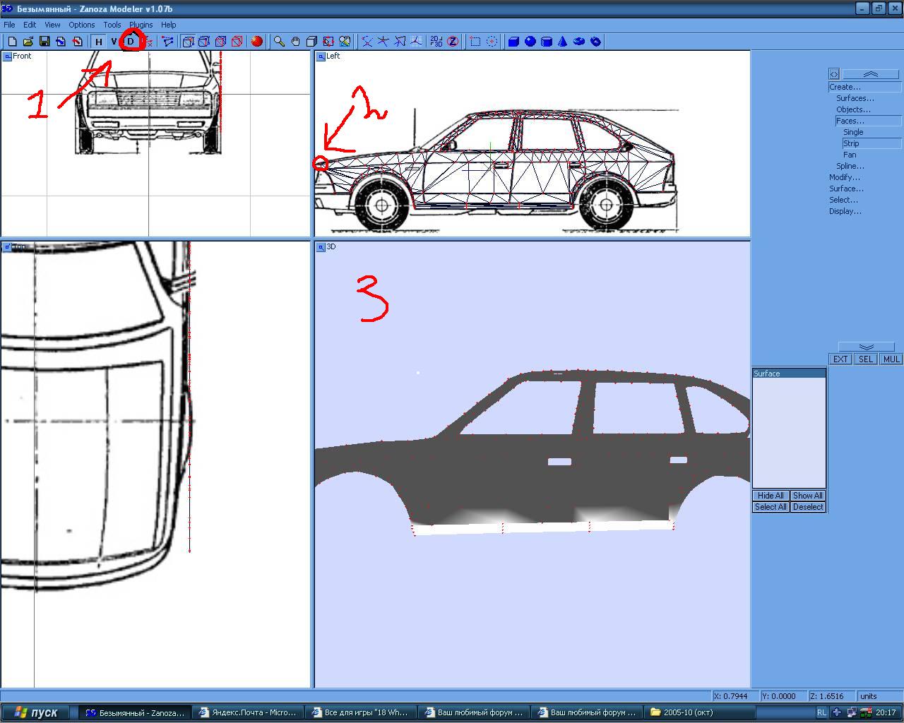 friman85 Опубликовано 5 ноября, 2005 Жалоба Поделиться Опубликовано 5 ноября, 2005 (изменено) Сегодня утром начал делать одну модельку... вот че сделал за два часа: ( смотреть скрин) На кривые полигоны - не обращайте внимания.. Это моя первая модель! вот что написано в учебнике - " переходим на вид точек, включаем передвижение D (в верху), на виде сбоку начинаем двигать точки над дверями, до края на виде сверху" КАК именно это сделать? обьясните? что, надо каждый полигон перетаскивать чтоли? И как это вообще...<{POST_SNAPBACK}>слушай я лично тоже клепаю свой первый москвич скачал обучение от тайзера ну нормально написал я понял держи ссылку может поможет http://mtc.gta.ovl.ru/pafiledb.php?action=file&id=28 ! :) если чего не понял говори попробую ответить только на поверхностные вопросы! Изменено 5 ноября, 2005 пользователем friman85 Цитата Ссылка на комментарий Поделиться на другие сайты Поделиться