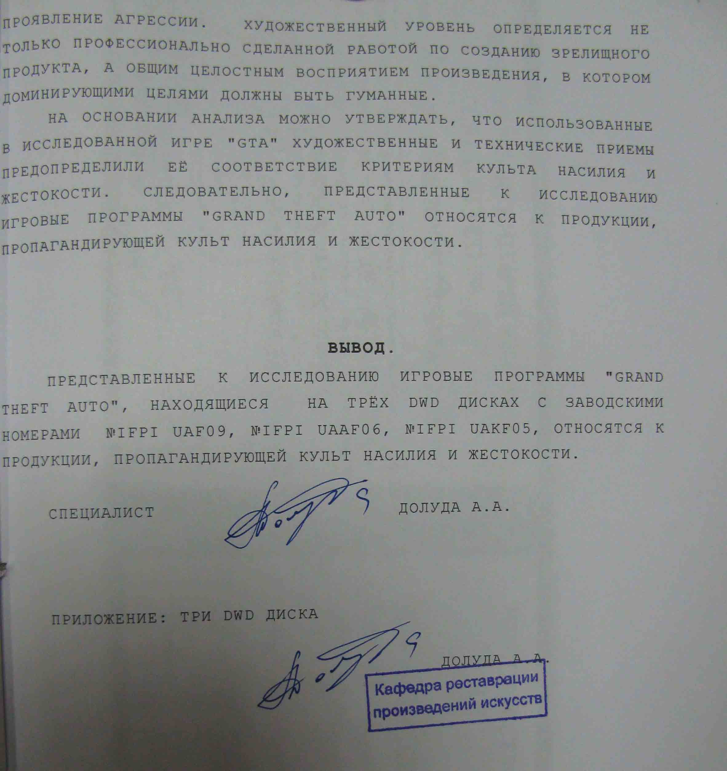 [email protected] Опубликовано 16 декабря, 2009 Жалоба Поделиться Опубликовано 16 декабря, 2009 Вот фото диска.Он имеет Украинскую марку.И разрешен для продажи на територии Украины. Вопрос о пиратки не стоит. Обвинение о игре GTA,которая якобы пропагандирует культ насилия и жестокости. Будет интересно выложу офицальное заключения эксперта. [email protected] - неспеши с выводом. То что там наклеена марка ничего не значит. С марками или голограммами продается разнообразная пиратская продукция. Не путай Украину и Россию. Диск официально продаётся на Украине. Вопрос не происхождении диска.Был бы он 1С - была бы таже самая возня в суде.Ну как же может пиратка официально продаваться? :) Официально продается только коробки от 1С Цитата GCU Car Pack - лучший глобальный мод для GTA 4. © 2003-2021 GTA.com.ua Ссылка на комментарий Поделиться на другие сайты Поделиться