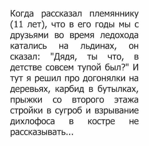 Пёс-Призрак Опубликовано 8 декабря, 2017 Жалоба Поделиться Опубликовано 8 декабря, 2017 [spoiler=+16]В мое время мы мерялись.. кхм.. или например кто выше обоссыт гараж Сиськи, письки и прочий "разврат" в то время мы видели только в дешевых эротических фильмах по ТВ и лишь немногие везунчики на VHS но это уже другая история Во всяком случае в мое время секаса в 13-14 лет не было, меня это обошло стороной. Но у всех оно было по-разному.Ну а то что творит нынешняя молодежь, порой даже у моих родителей волосы дыбом встают Хотя им под 70-м лет уже. Цитата Ссылка на комментарий Поделиться на другие сайты Поделиться