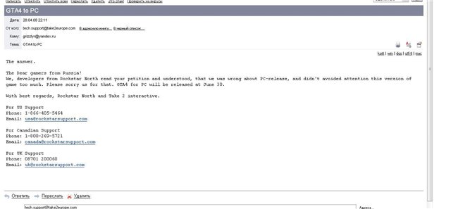 [email protected] Опубликовано 8 мая, 2008 Жалоба Поделиться Опубликовано 8 мая, 2008 И так в полне возможно что выход игры GTA:4 на PC очень скоро.Один знакомый человек с сайта (playground.ru) отослал письмо (Rockstar) и получил ответ в скором времени. Что-б доказать всем что эта правда, он сделал Скриншот письма ответа от Rockstar. Посмотреть вы его можете ниже.Ответ. Дорогие геймеры из России!Я, представитель Rockstar North прочтя ваше письмо, осознал, что мы совершили ошибку, не уделя такого внимание PC версии GTA4. Просим свои извинения и сообщаем вам, что PC версия GTA 4 будет реализована 30 Июня. С наилучшими пожеланиями, Rockstar North Взято с http://www.tds-team.net/news/54/#comments Может фейк а может и нет, в адресе вроде написано чего то там[email protected] Цитата Ссылка на комментарий Поделиться на другие сайты Поделиться