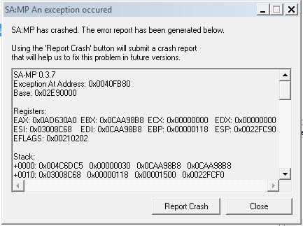 Sestowner Опубликовано 6 декабря, 2015 Жалоба Поделиться Опубликовано 6 декабря, 2015 Запускаю SA:MP вылетает ошибка[spoiler=]SA-MP 0.3.7Exception At Address: 0x0040FB80Base: 0x02E80000 Registers:EAX: 0x0CC35DA0 EBX: 0x0CC33D58 ECX: 0x00000000 EDX: 0x00000000ESI: 0x02FF8C68 EDI: 0x0CC33D58 EBP: 0x00000118 ESP: 0x0022FC90EFLAGS: 0x00210202 Stack:+0000: 0x004C6DC5 0x00000030 0x0CC33D58 0x0CC33D58+0010: 0x02FF8C68 0x00000118 0x00001500 0x0022FCF0+0020: 0x0022FCF0 0x0CC35DA0 0x02FF8C68 0x04358590+0030: 0x0022FCF0 0x008A62EC 0x008A62EC 0x02FF8C68+0040: 0x00001500 0x004C549D 0x043584C8 0x004C52F0+0050: 0x0022FCF0 0x0CC33D58 0x02FF8C68 0x0022FF78+0060: 0x0083BC8B 0xFFFFFFFF 0x004C7369 0x0CC33D58+0070: 0x0CC33D58 0x02FF8C68 0x005373CF 0x0CC33D58+0080: 0x008E48AC 0x00000118 0x02FF8C68 0x000015E0+0090: 0x0040C814 0x008E48AC 0x02FF8C68 0x000015E0+00A0: 0x00000118 0x00000000 0x008E4A60 0xED080635+00B0: 0x0C350800 0x00012000 0x7673C313 0x0000018C+00C0: 0xFFFFFFFF 0x00000000 0x019818F8 0x0040E2CA+00D0: 0x0C350800 0xFFFFFFFF 0x00000000 0x00000008+00E0: 0x00000000 0x76A580C8 0x00000000 0x00000000+00F0: 0x00000024 0x0040EAC8 0x00000000 0x00000001+0100: 0x00000000 0x00863B10 0x005BA263 0x00000000+0110: 0x00863A6C 0x0086A578 0x00000000 0x0053BCAB+0120: 0x00863B10 0x00863B10 0x00863A90 0x00863B10+0130: 0x0000000A 0x0053E593 0x00863B10 0x00748D50+0140: 0x7673D8F3 0x00000000 0x0022FF88 0x7FFDA000+0150: 0x016B0000 0x00000008 0x016B5F38 0x00000008+0160: 0x00000100 0x00000008 0x00000102 0x44200000+0170: 0x44000000 0x00000000 0x00000000 0x00000500+0180: 0x00000400 0x00000000 0x0022FE54 0x000C00B0+0190: 0x00000113 0x00004242 0x00000000 0x002C2240+01A0: 0x00000280 0x00000200 0x0000002C 0x0022FE2C+01B0: 0x00825EE4 0x7673D8F3 0x00000000 0x7FFDA000+01C0: 0xFFFFFFFF 0x00821D57 0x00000065 0x00000065+01D0: 0x0022FF88 0x00824731 0x00400000 0x00000000+01E0: 0x018E2465 0x0000000A 0x00000094 0x00000005+01F0: 0x00000001 0x00000A28 0x00000002 0x76726553+0200: 0x20656369 0x6B636150 0x00003320 0x00000000+0210: 0x00000000 0x00000000 0x00000000 0x00000000+0220: 0x00000000 0x00000000 0x00000000 0x00000000+0230: 0x00000000 0x00000000 0x00000000 0x00000000+0240: 0x00000000 0x00000000 0x00000000 0x00000000+0250: 0x00000000 0x00000000 0x00000000 0x00000000+0260: 0x00000000 0x00000000 0x00000000 0x00000000+0270: 0x00000000 0x00000000 0x008245C8 0x00000000 SCM Op: 0x0, lDbg: 0 LastRendObj: 0 Game Version: EU 1.0 [spoiler=скрин]http://gta.com.ua/forum/public/style_images/master/attachicon.gifСнимок.JPGСтавил чистую GTA, установил последнюю версию SA:MPа. Ошибка не пропала.Раньше никаких ошибок не было. Чтобы не было такой ошибки нужно запустить SA:MP в режиме совместимости с Windows 98 / Windows ME. Цитата Ссылка на комментарий Поделиться на другие сайты Поделиться