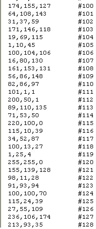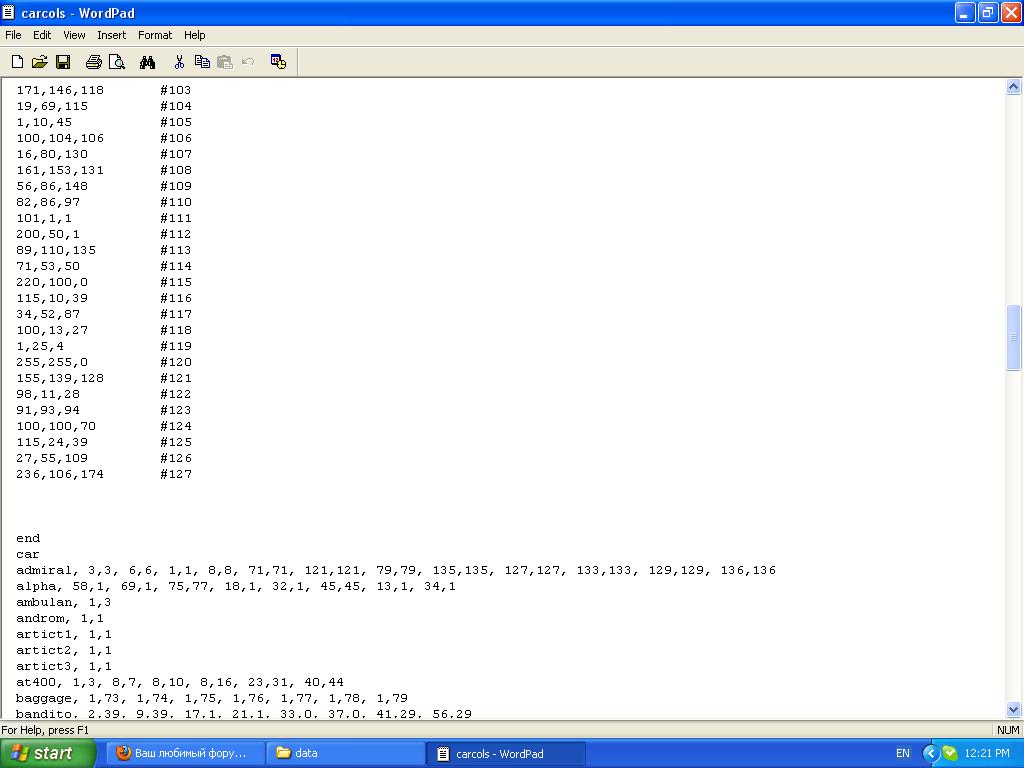 Thunderbolt Опубликовано 5 марта, 2010 Жалоба Поделиться Опубликовано 5 марта, 2010 Всё, поменял. Работает Ещё вопрос назрел теперь, как мне теперь менять цвета на машины? Вот скриншот того, что у меня счас в gta sa/data/carcols.dat carcols.dat Как мне теперь вставлять например такой цвет 178,178,186 # 7 tk silver bright blueесли не хочешь заморачиваться, то просто заменяешь нужную строчку и всё. но если хочется сохранить стандартную цветовую палитру игры, то можно добавить дополнительные цвета. меняй номер строчки с 7 на номер цвета, который идёт за последним цветом (если у тебя стандартный carcols.dat, то последний номер будет 126, значит меняешь его на 127), номера должны быть в строгой последовательности, иначе игра не запустится. затем вставляешь строку. и наконец меняешь в строке с цветами машины номер заменённого цвета, то есть к примеру было так feltzer, 73,1, 74,1, 75,1, 7,1. вместо 7 пишешь 127, должно получиться так feltzer, 73,1, 74,1, 75,1, 127,1 и вот у тебя получился дополнительно добавленный цвет. учти что нельзя так добавлять очень много цветов, иначе игра их некорректно будет отображать. Цитата Ссылка на комментарий Поделиться на другие сайты Поделиться