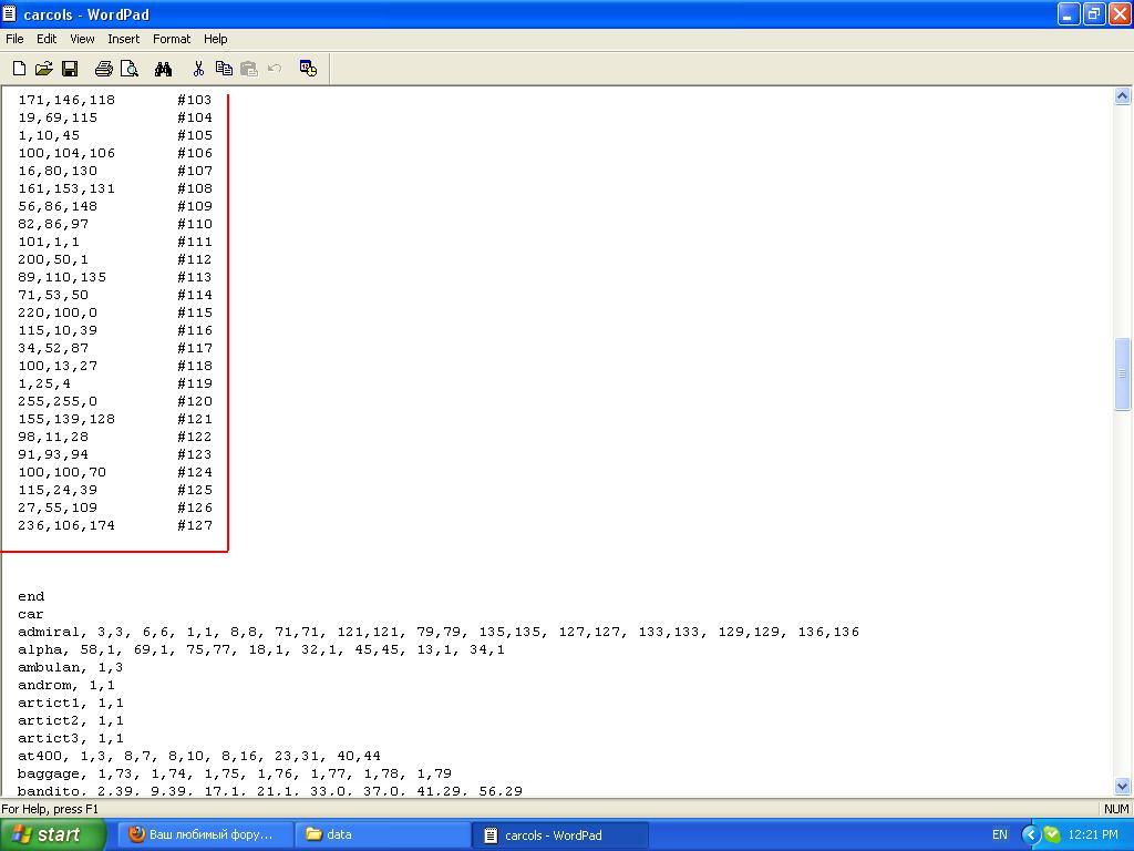 DimoNPH Опубликовано 5 марта, 2010 Жалоба Поделиться Опубликовано 5 марта, 2010 (изменено) если не хочешь заморачиваться, то просто заменяешь нужную строчку и всё. но если хочется сохранить стандартную цветовую палитру игры, то можно добавить дополнительные цвета. меняй номер строчки с 7 на номер цвета, который идёт за последним цветом (если у тебя стандартный carcols.dat, то последний номер будет 126, значит меняешь его на 127), номера должны быть в строгой последовательности, иначе игра не запустится. затем вставляешь строку. и наконец меняешь в строке с цветами машины номер заменённого цвета, то есть к примеру было так feltzer, 73,1, 74,1, 75,1, 7,1. вместо 7 пишешь 127, должно получиться так feltzer, 73,1, 74,1, 75,1, 127,1 и вот у тебя получился дополнительно добавленный цвет. учти что нельзя так добавлять очень много цветов, иначе игра их некорректно будет отображать.Как-то не допёрло) Или может ты не понял. Смотри, скриншот это то, что находится в папке.Я спрашивал не про те цвета, где указывается название машины (пр. alpha, 58,1, 69,1, 75,77, 18,1, 32,1, 45,45, 13,1, 34,1), а вот про это Мне нужно например изменить у sultan'a цвета, вот такой например 244,88,0 # 70 Z33 orange red Как мне его заменить там (скриншот 2) Изменено 5 марта, 2010 пользователем DimoNPH Цитата Ссылка на комментарий Поделиться на другие сайты Поделиться