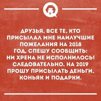 Kesha F1 Опубликовано 31 декабря, 2018 Жалоба Поделиться Опубликовано 31 декабря, 2018 Поздравляю всех форумчан с наступающим Новым Годом! Желаю Вам всего самого доброго и хорошего. Пусть невзгоды обходят вас стороной и удача сопутствует во всех делах! 2019 Цитата Список дисциплинарных мер к пользователям GTA.COM.UA«Ламеров надо обучать. Игроков уважать. Читеров мочить в сортире». © Kesha_F1«Дураку закон не писан. Если писан, то не читан. Если читан, то не понят. Если понят, то не так». © Народное Ссылка на комментарий Поделиться на другие сайты Поделиться