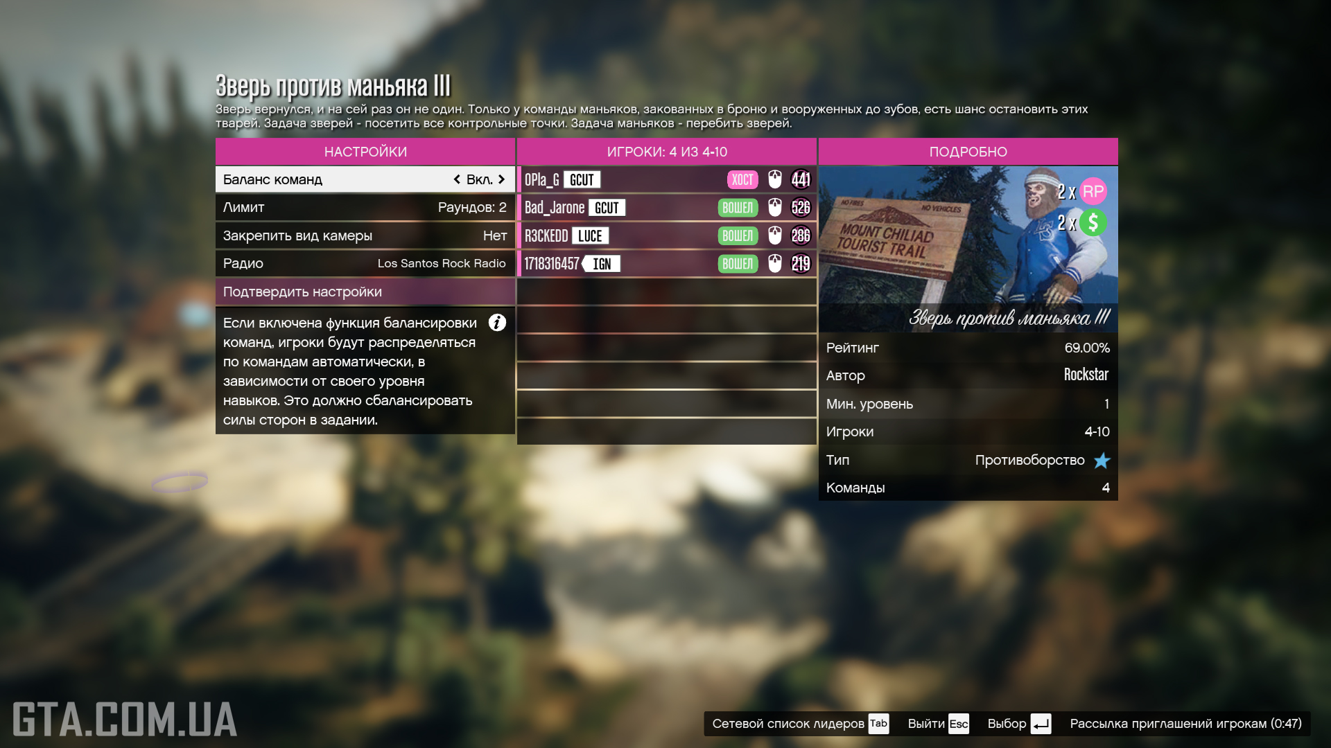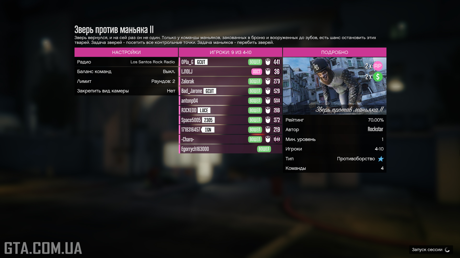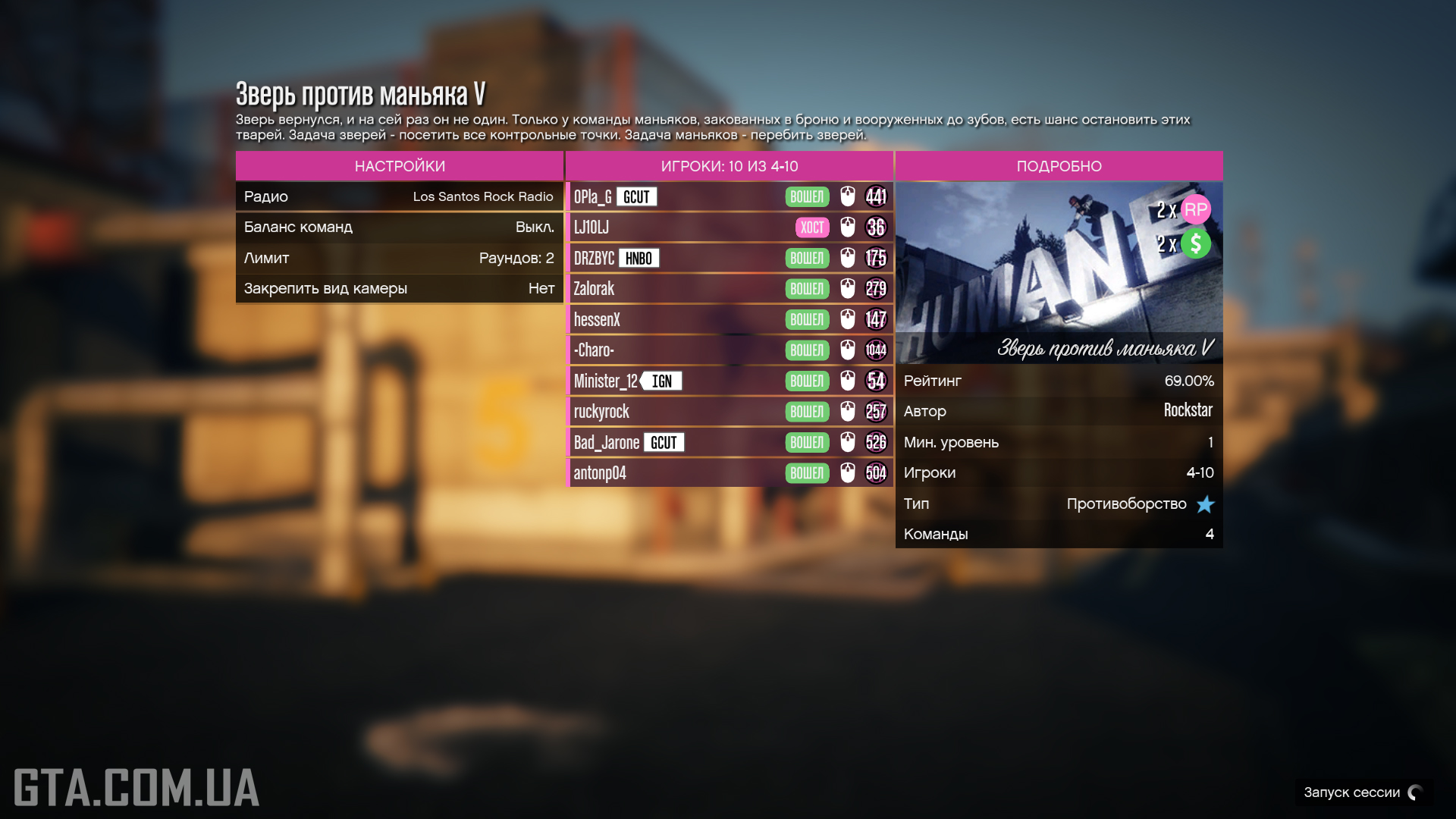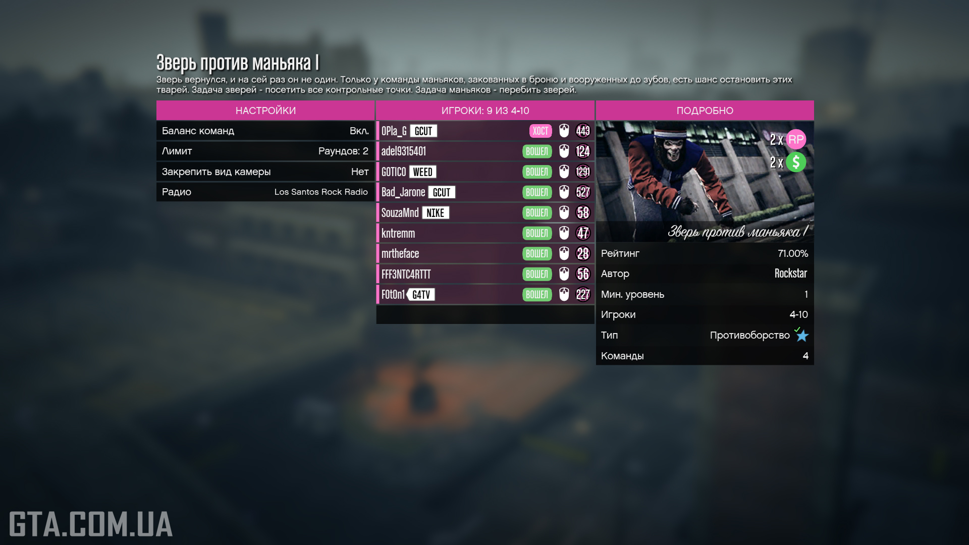 Когда режим доступен, в него можно зайти через приглашение, через главное меню (если он выведен туда), через маркер «Избранная серия» на площади Легиона или через меню паузы (Сеть → Дела → Начать дело → Созданные Rockstar → Противоборство). Раундов можно поставить от 1 до 2 выигранных, и маньяк, убивший зверя, занимает его место в следующем. Играть могут все вне зависимости от уровня. Участвуют от 4 до 10 человек, которые делятся на четыре команды: звери и три вида маньяков.Команда: звери
