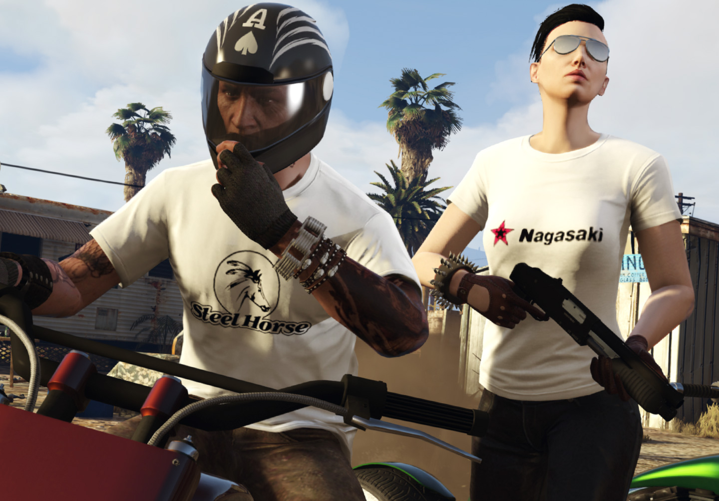 Зайдите в GTA Online на этой неделе до 8 мая вы бесплатно получите белые футболки Steel Horse и Nagasaki. Новинки можно примерить в магазине одежды. Подойдите к стойке с топами. Далее найдите раздел Особый вверх → Логотипы производителей.