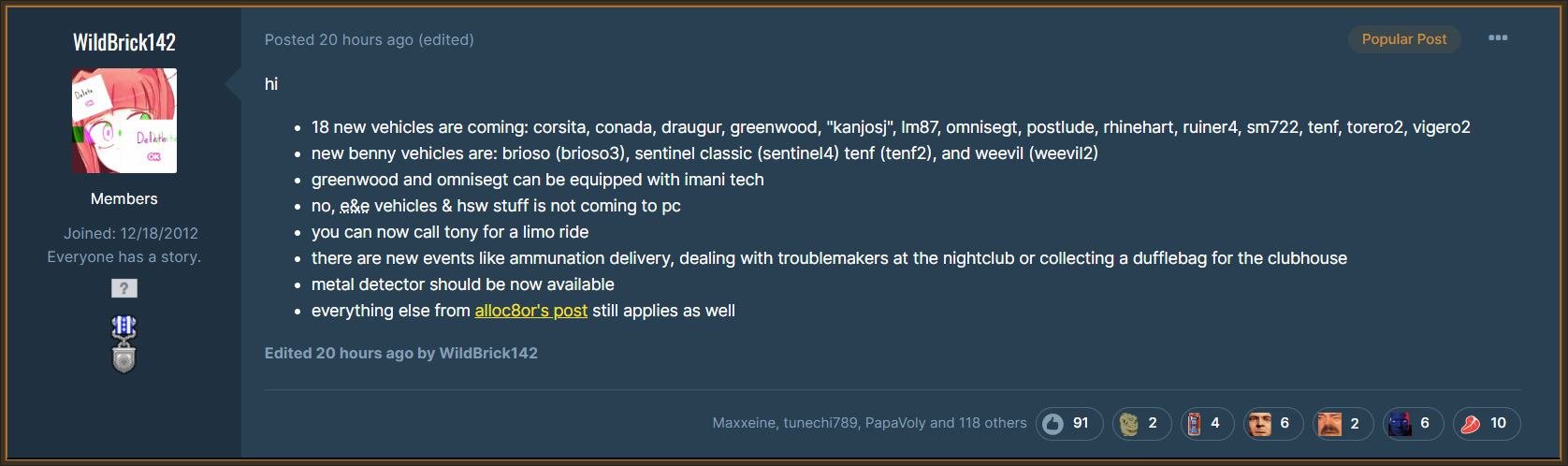 1319Надёжный источник в лице датамайнера WildBrick142 поделился ещё необнародованными деталями дополнения для GTA Online, которое появится завтра приблизительно в 13:00 по киевскому времени.