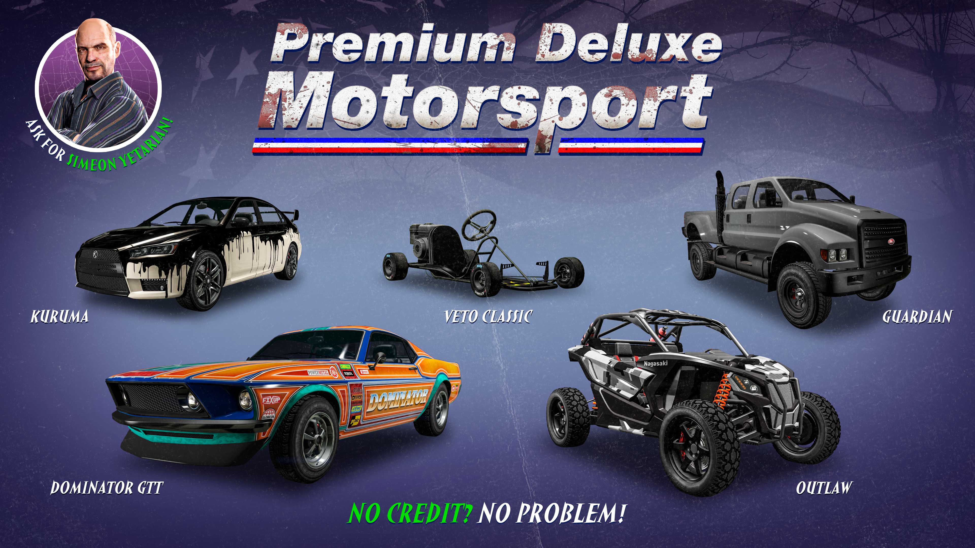 В Premium Deluxe Motorsport Симеон продаёт Karin Kuruma, Dinka Veto Classic, Vapid Guardian, Vapid Dominator GTT и Nagasaki Outlaw. Luxury Autos предлагает приобрести новенький Übermacht Rhinehart и Lampadati Tigon.Гонки
