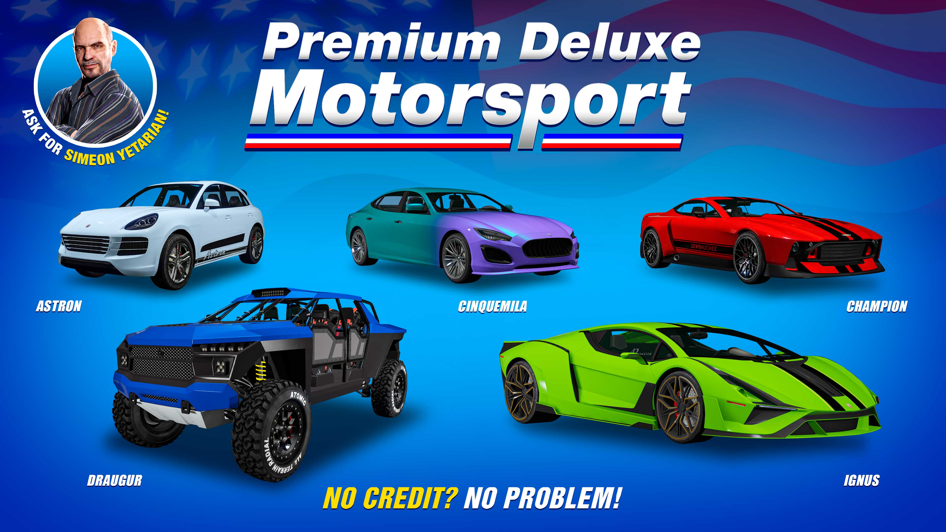 В Premium Deluxe Motorsport Симеон продаёт Pfister Astron, Lampadati Cinquemila, Declasse Draugur, Dewbauchee Champion и Pegassi Ignus. Luxury Autos предлагает приобрести Declasse Vigero ZX и Lampadati Corsita.Гонки