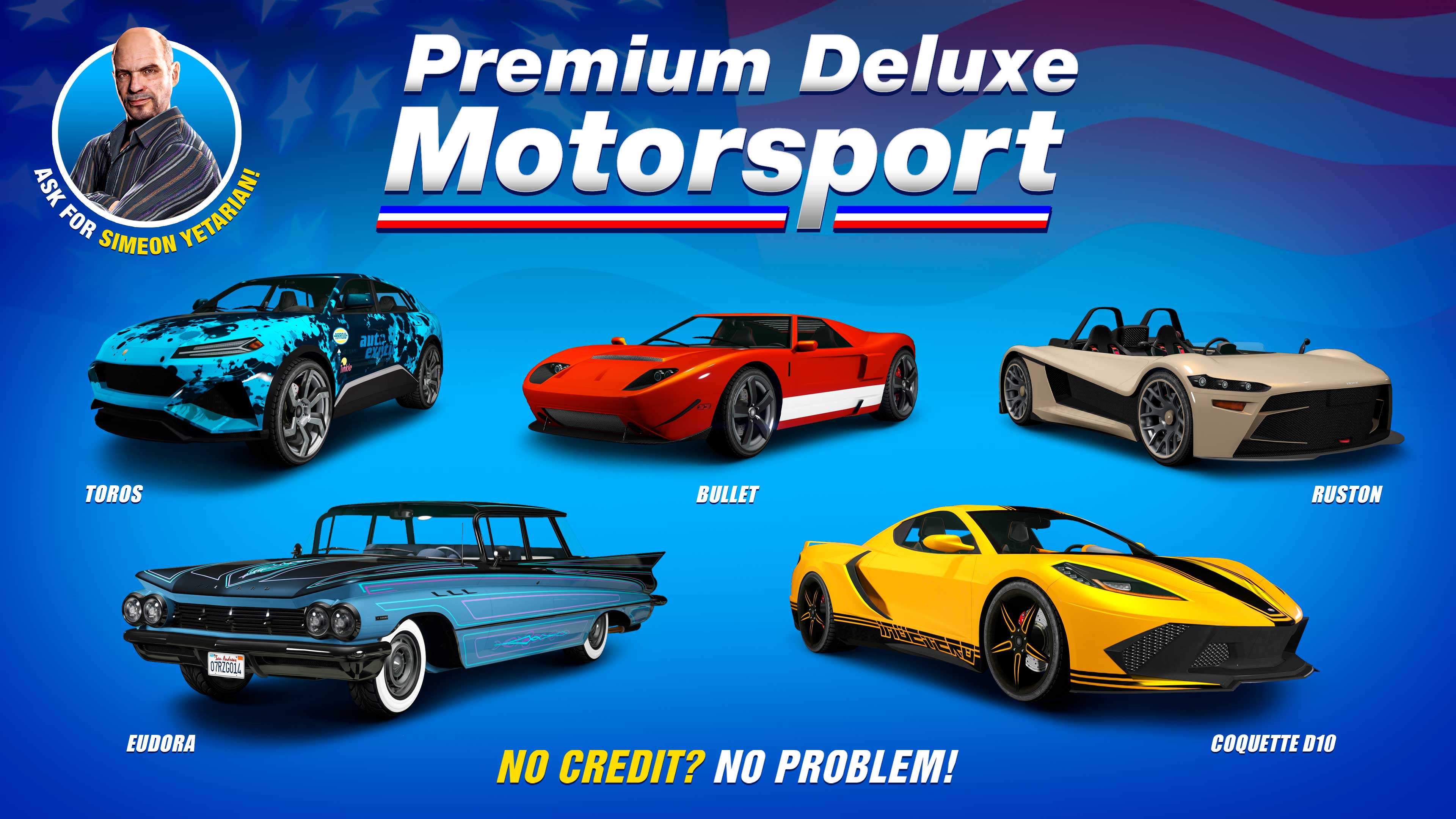В Premium Deluxe Motorsport Симеон продаёт Pegassi Toros, Vapid Bullet, Hijak Ruston, лимитированную по времени новинку Willard Eudora и Invetero Coquette D10. Luxury Autos предлагает приобрести Överflöd Tyrant и Grotti X80 Proto.Гонки