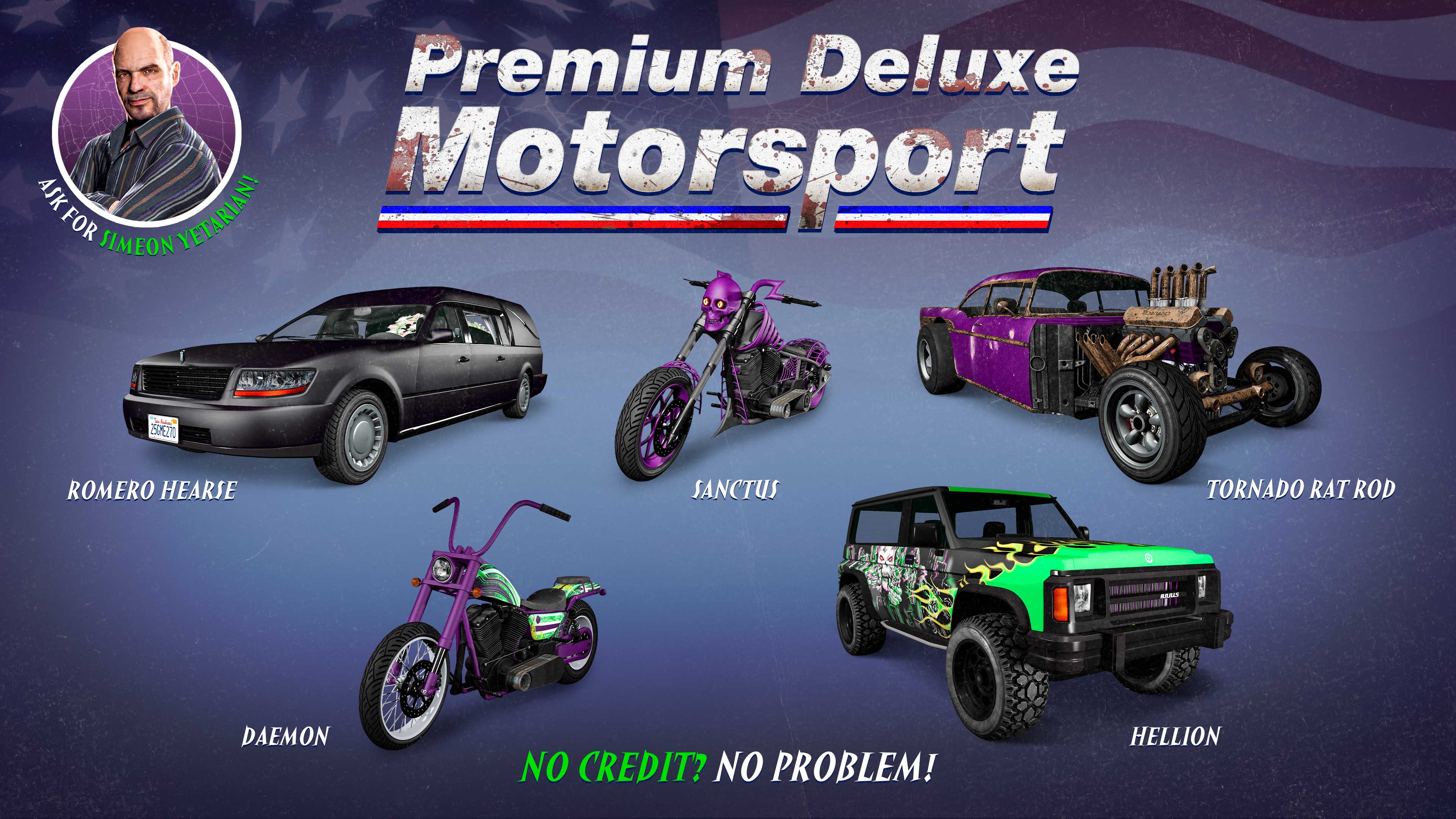 В Premium Deluxe Motorsport Симеон продаёт Chariot Romero Hearse, LCC Sanctus, Declasse Tornado Rat Rod, Western Daemon и Annis Hellion. Luxury Autos предлагает приобрести Karin Asterope GZ и Canis Terminus.Испытания