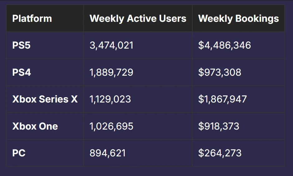 Следующие показатели, среднее количество активных игроков и дохода от них в неделю на разных платформах, исчерпывающе отвечают на вопрос, почему ПК не в приоритете. PlayStation же полностью доминирует над конкурентами.- PS5 — 3,5 миллиона человек (3 474 021) — 4,5 млн долларов ($4 486 356), и это 53% от общего числа;