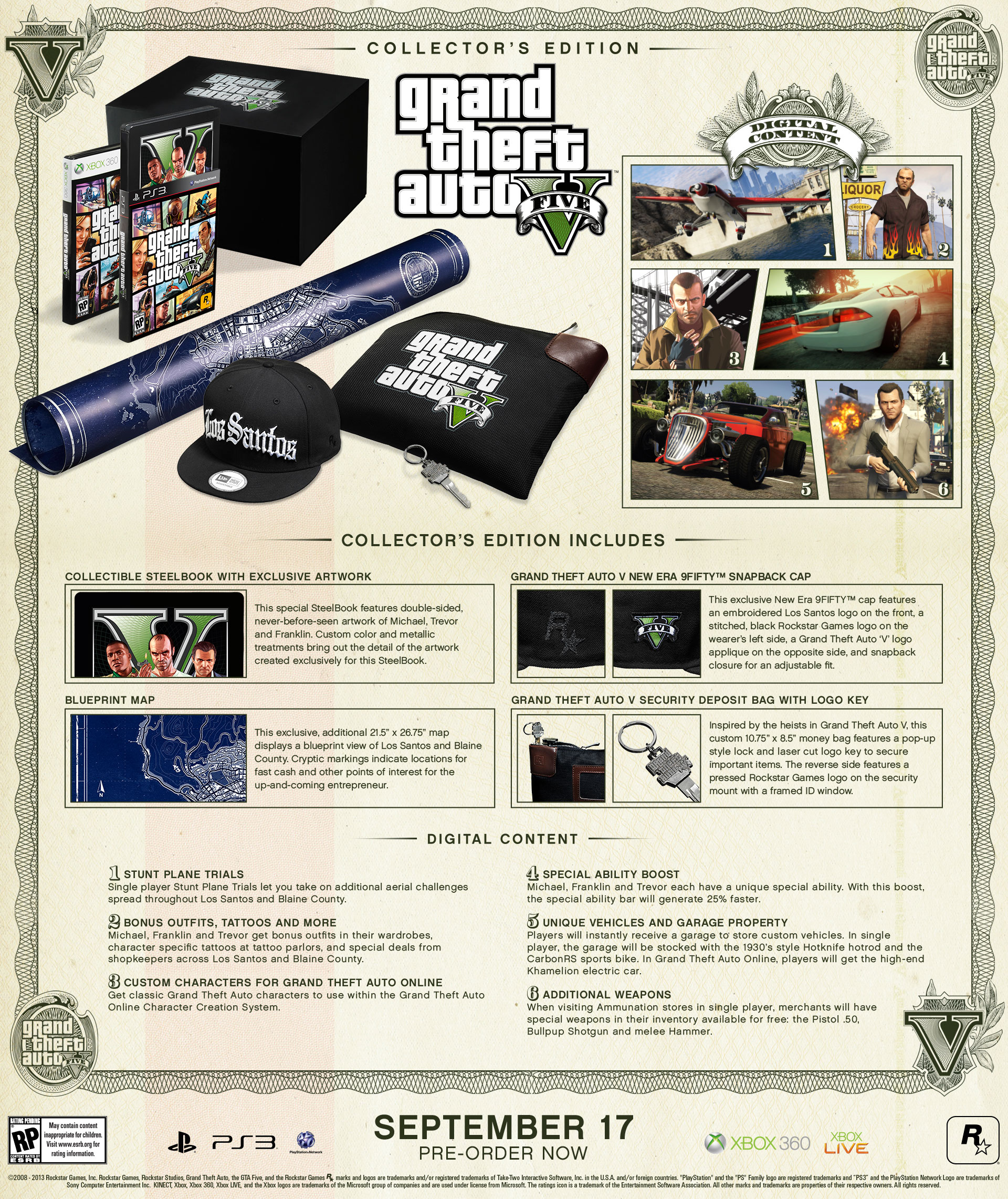- Коллекционную стальную книгу с эксклюзивными артами. Книга включает в себя ранее не опубликованные арты Майкла, Тревора и Франклина.