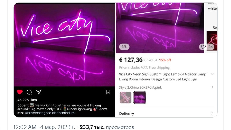 1204Дополнение от 04.03: Похоже, Фифти понравился хайп, разогнанный GTA-сообществом, и вскоре он опубликовал новый пост с изображением, как выяснили в Твиттере, взятом с… Ali Express.