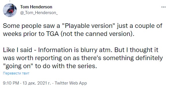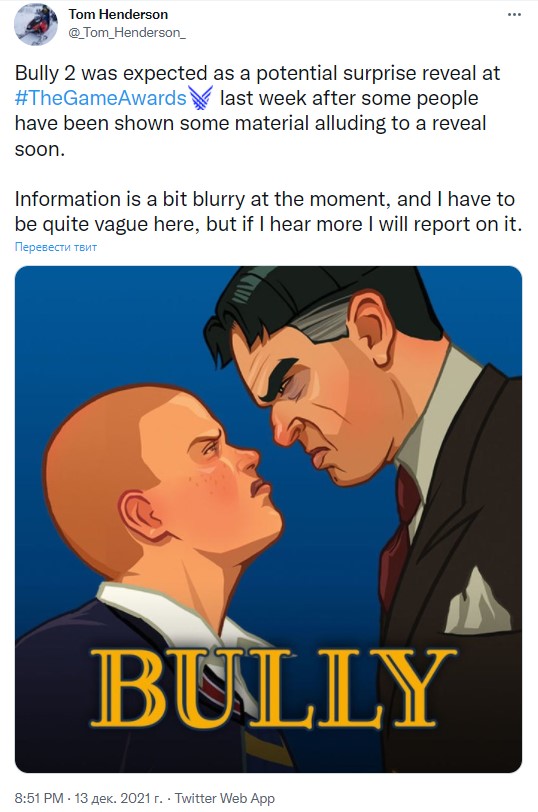 903Том Хендерсон, известный нашим читателям по слухам о GTA 6, поделился неожиданным. По его информации, анонс продолжения Bully мог стать сюрпризом на недавнем мероприятии The Game Awards, на котором показывают новинки и награждают главные игры года (первым номером в 2021-ом стала It Takes Two, которая заимела проблемы с правообладателем GTA). «Некоторые люди», как пишет Хендерсон, видели играбельную версию (не ту, что законсервировали годы назад) за несколько недель до TGA. Пока что инфу инсайдер называет «размытой», но говорит, что что-то определённо происходит. Среди ответивших оказался и редактор Game Informer, который быстро удалил свой твит.