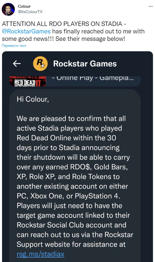 614Rockstar Games пришла к решению проблемы, нависшей над всеми «ковбоям» в Red Dead Online, игравшими через Google Stadia. В частном порядке сотрудники компании сообщили тому самому парню, который «дистанционно» наиграл 6 тысяч часов в RDO, что игровой прогресс (включая опыт, деньги, золото и др.) можно перенести на ПК, PlayStation 4 или Xbox One.