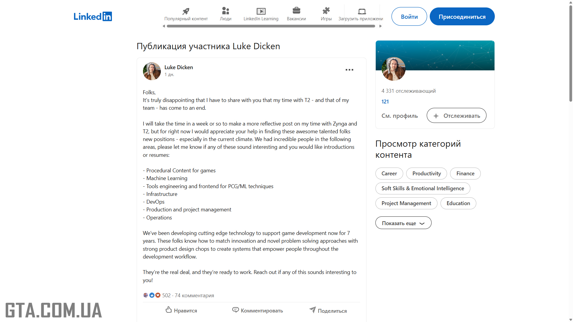 29Глава отдела ИИ Take-Two Люк Дикен сообщил, что он был уволен. Кроме него сократили неназванное количество его подчинённых. Сейчас специалисты по искусственному интеллекту ищут новую работу.