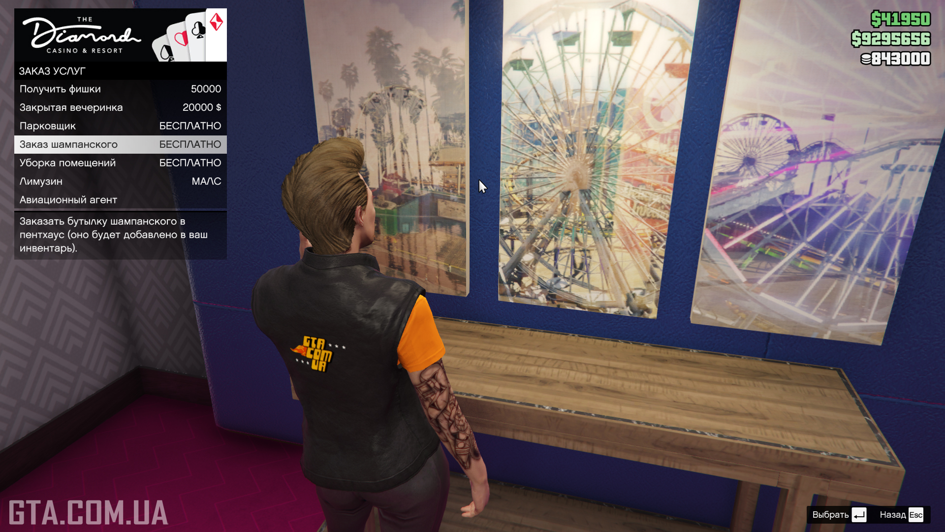 - Замовлення шампанського в пентхаус. Після доставки пляшку шампанського буде додано в інвентар. Безкоштовно.