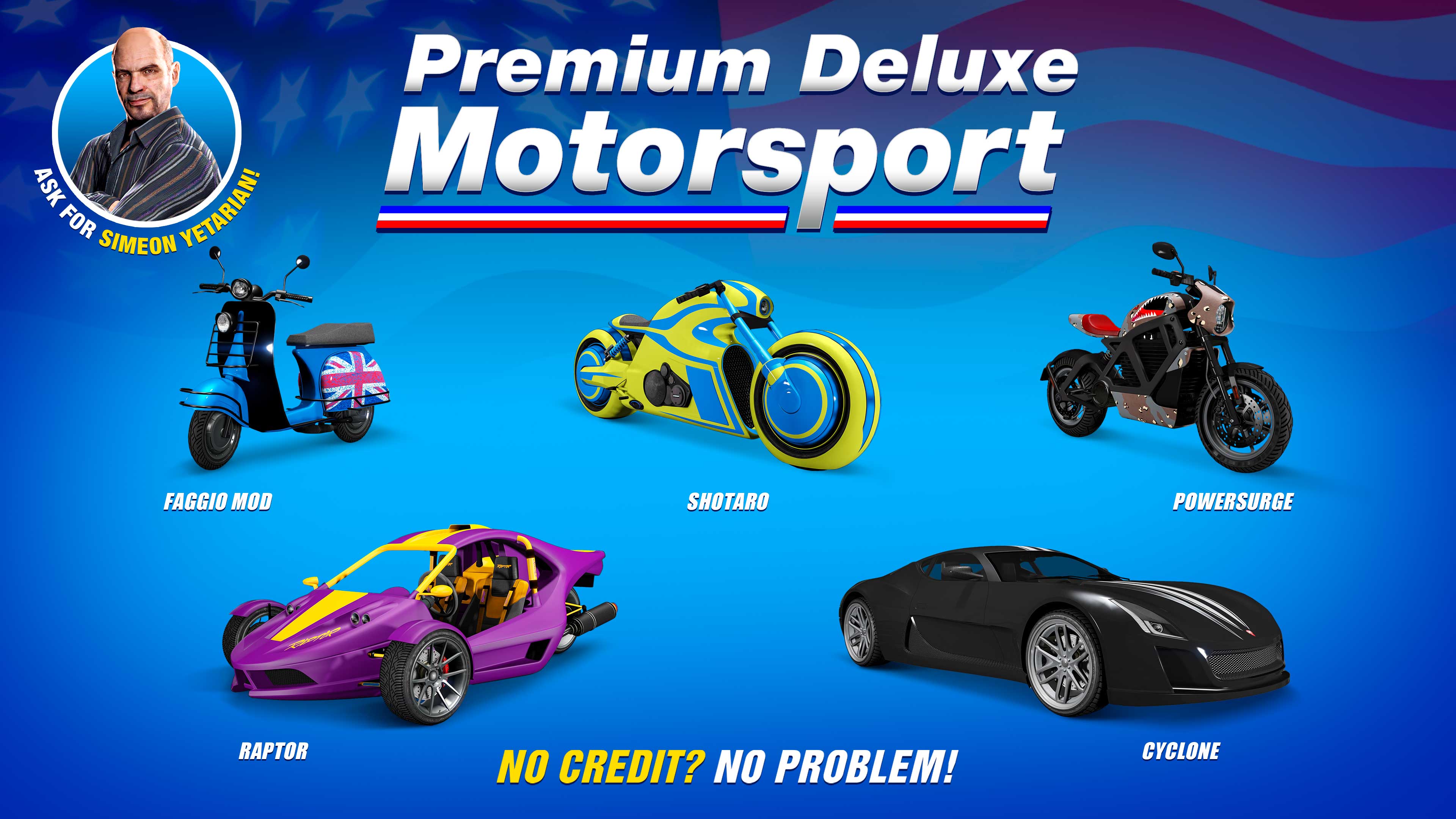 В Premium Deluxe Motorsport Сімеон продає Pegassi Faggio Mod, Nagasaki Shotaro, Western Powersurge, BF Raptor та Coil Cyclone. Luxury Autos пропонує придбати Nagasaki Shinobi та Vapid Flash GT.Гонки