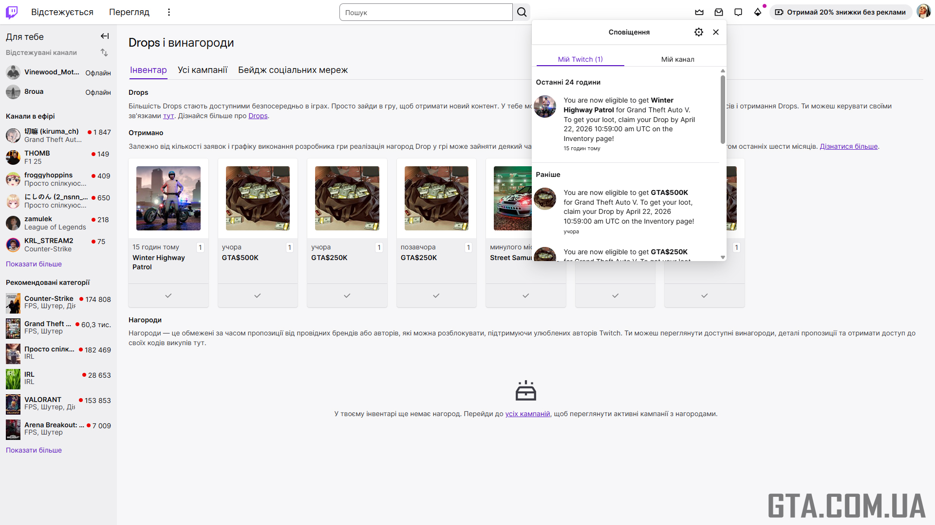 Для початку потрібно зв’язати свій Twitch з акаунтом на сайті Rockstar Games та подивитися (можна просто відкрити у вкладці та поставити звук на мінімум — прогрес буде враховуватися) вибрані стріми. Щоб не промахнутися, переходьте на сторінки: