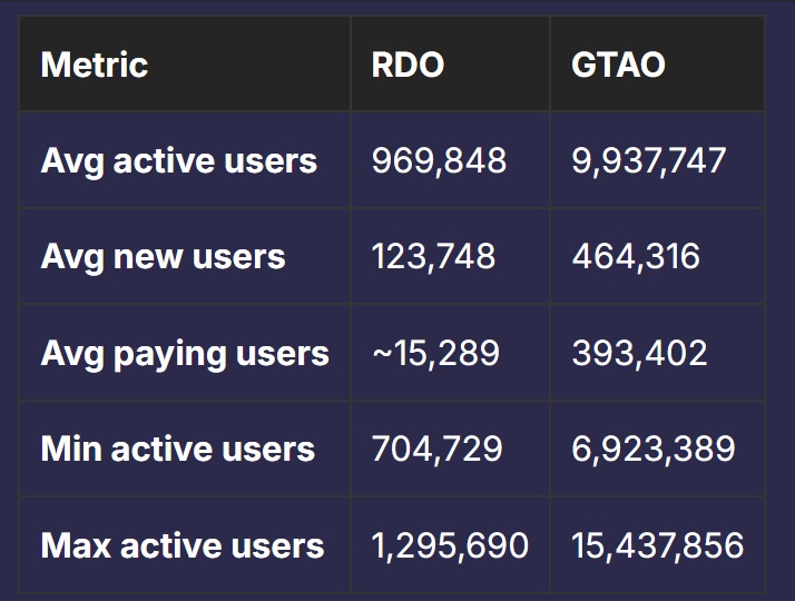 - Аудиторія активних гравців складає без малого 1 мільйон людей на тиждень — 969 848 (у 10 разів менше, ніж в GTA Online).