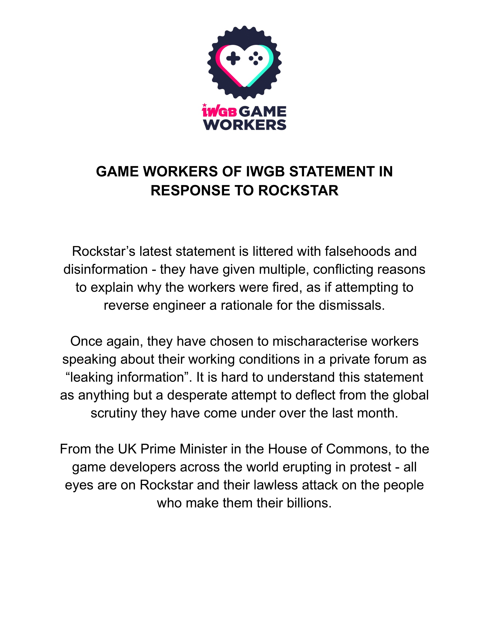 Представники Independent Workers of Great Britain відреагували, звинувативши «рок-зірок» у брехні та дезінформації. Діячі профспілки вказують на те, що ніякого обговорення робочих проектів у Discord не велось — там обмірковували лише моменти, пов’язані з умовами праці. Однією з причин конфлікту може бути те, що на сервері знаходились журналіст, розробник з конкуруючої компанії та багато інших анонімних осіб. В IWGB стверджують, що модерували учасників чатів, і нікого стороннього бути не могло. У відповідь R* парирували, що в профспілці поняття не мають, що відбувалось на тому сервері в Discord.