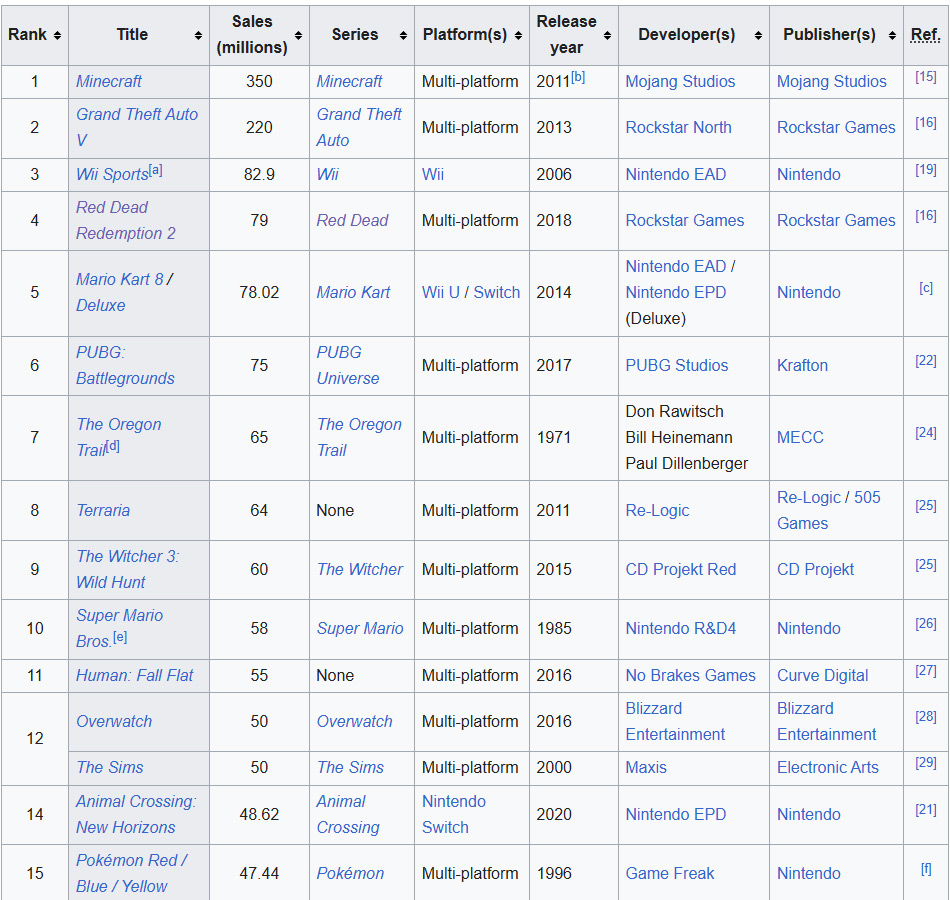 - GTA 5 та GTA Online — 220 мільйонів (плюс 5 млн). Відставання від першого місця ще скоротить, але наблизитися до Minecraft навряд чи зможе.